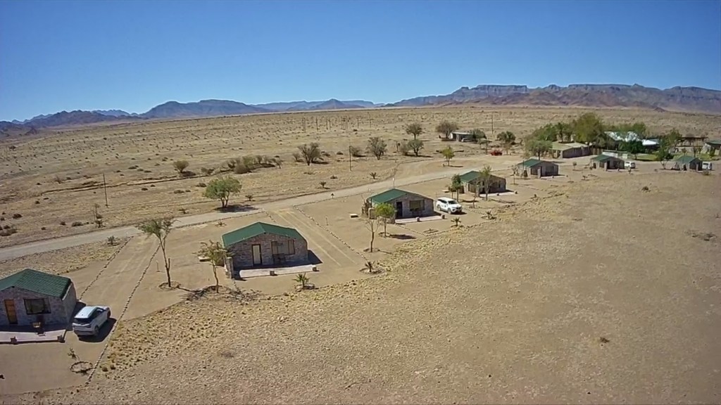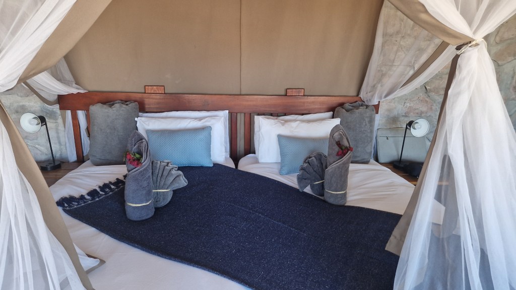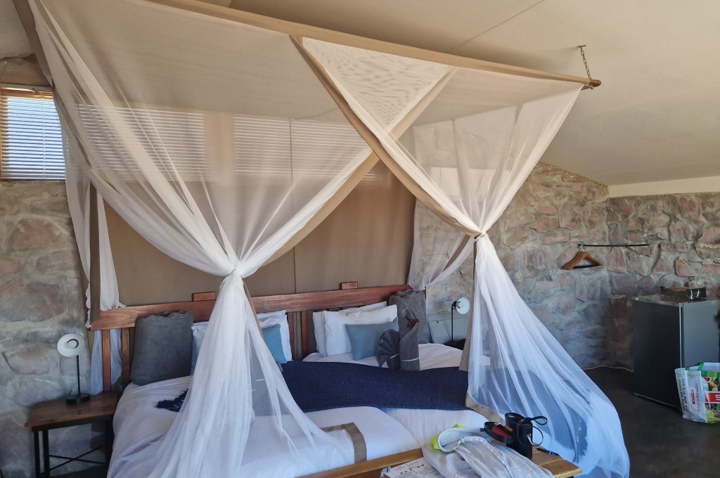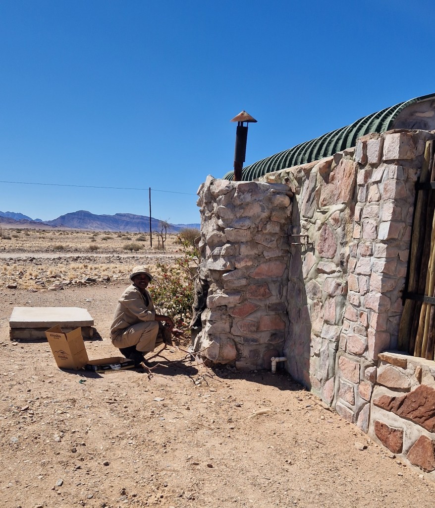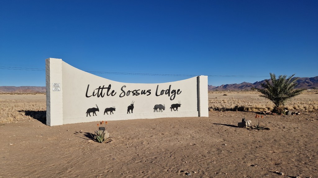 Trotz aller Widrigkeiten sind wir weit vor unserem Zeitplan in der Little Sossus Lodge angekommen. Dort wurden wir von einem grimmig drein schauenden Portier empfangen, der uns erstmal mit den Spielregeln vertraut machte. Frühstück von 7 bis 9. Abendessen um 7. Und um 7 heißt um 7! Außerdem gibt es kein kostenfreies WLAN. Spätestens da versteinerte sich die Miene meiner Ehefrau (selbst wusste ich ja noch meine namibische SIM-Karte mit genug Datenvolumen mein Eigen) ehe sich das Ganze als Scherz herausstellte. Wir haben hier einen eigenen freistehenden Bungalow mit einem rießig großen Zimmer. Hier ist bewusst im Singular geschrieben, denn selbst die Sanitärbereiche sind nur durch Bruchsteinwände welche nicht bis zur Decke reichen und einem Vorhang vom Schlafbereich abgetrennt. Dies hat schon etwas uriges. Das Warmwasser wird morgens durch einen von außen beheizbaren Kamin bereitgestellt. Alles sehr traditionell und mit viel Charme.