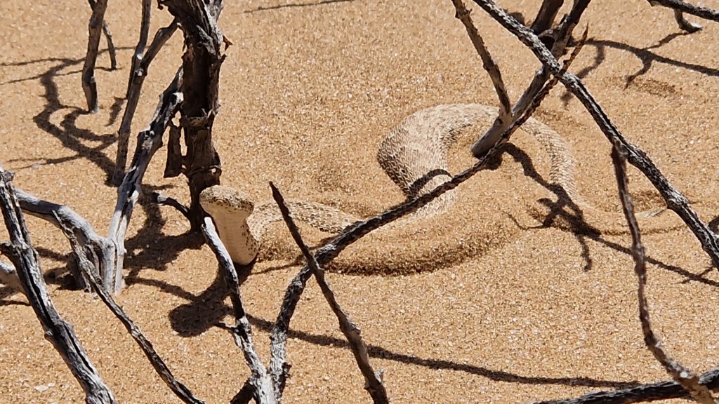 Spinnennester der Sun Dancing Spider im Sand wurden uns auch gezeigt, allerdings blieben diese unangetastet, da der neue Nestbau am Tag nicht zu schaffen gewesen wäre. Die Spinne wäre somit sicher verendet. Anders verhielt sich das allerdings mit den Sidewinder-Schlangen. Diese giftigen, aber nicht aggressiven Tiere buddeln sich rasch selber wieder ein.