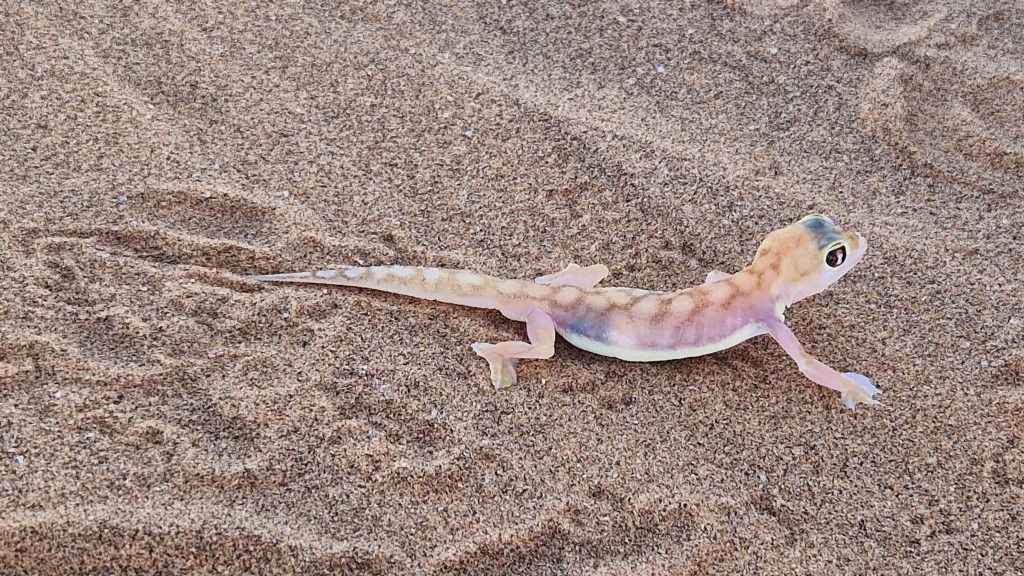 Als wir noch etwas weiter gefahren sind lernten wir eine Lektion über die überall sichtbaren Tok-Tokki-Käfer. Diese bilden quasi die Wasserversorgung in den Dünen. Sie klettern im Morgengrauen auf die Spitze der Düne und machen einen Kopfstand. Ihr Körper ist so aufgebaut, dass sie damit aus der Luftfeuchtigkeit das Wasser absorbieren und so um 30% ihres Körpergewichtes zulegen können. Dieses Wasser bringen sie dann in bereits vorgebaute Nester mit Treibgut wie Samen. Weitere Einzelheiten bringe ich jetzt nicht mehr zusammen, würden euch sicher vorm Bildschirm auch einschlafen lassen.