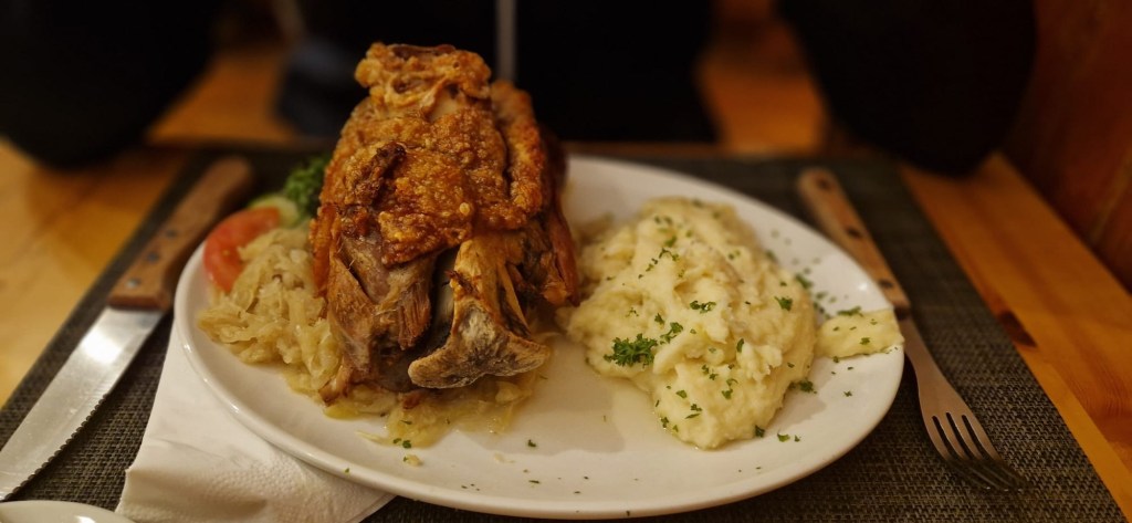 Unser italienischer Herbergsvater hat für uns am zweiten Abend Plätze im Restaurant „Altstadt“ reserviert. Das Lokal ist eine Mischung aus Aprés-Bar und Hofbräuhaus. Der komplette Verzehr einer Grillhaxe stellte den Autor kurz vor Probleme. Aber das Fleisch war sehr mager und schmeckte mitsamt dem Sauerkraut, dem Kartoffelbrei und dem deutschen Senf (Kühne Original German Mustard) ausgezeichnet. Nach dem Mahl blieben nur Schwarte und Knochen auf dem Teller, trotzdem musste der Besitzaufgabewille gegenüber der Bedienung eindeutig kommuniziert werden.
