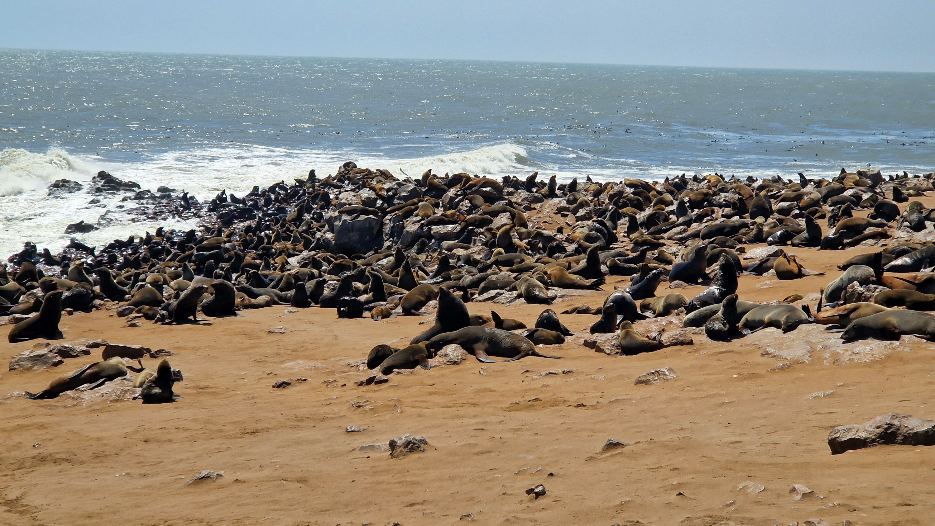 Die eigentliche Attraktion in Cape Cross ist aber eine riesige Robbenkolonie. Tausende Kühe mit ihren Jungen verbringen dort den Tag mit baden, fischen und relaxen in der Sonne. Die Bullen fressen sich derweil anderswo ordentlich Speck an und kommen nur gelegentlich zum Robben poppen vorbei. Unser Reiseführer spricht von bis zu 210.000 Zwergpelzrobben.